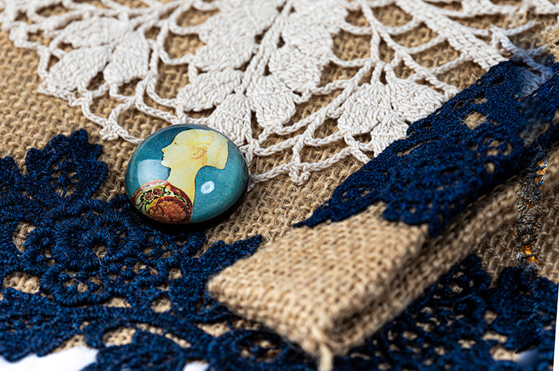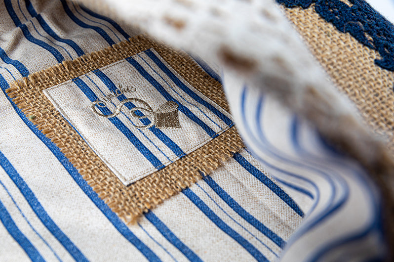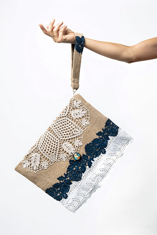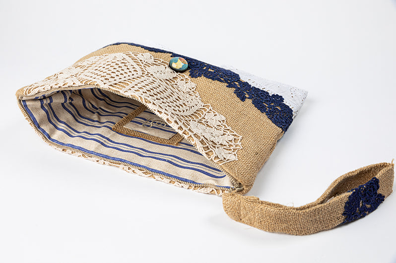 Borsa interamente realizzata in juta naturale, impreziosita da ricercati pizzi e merletti.