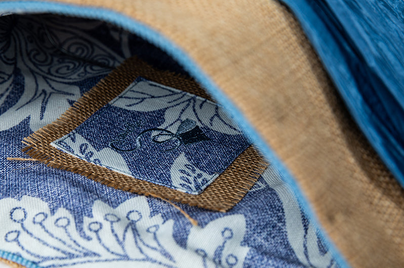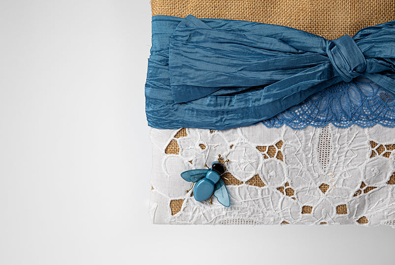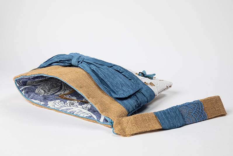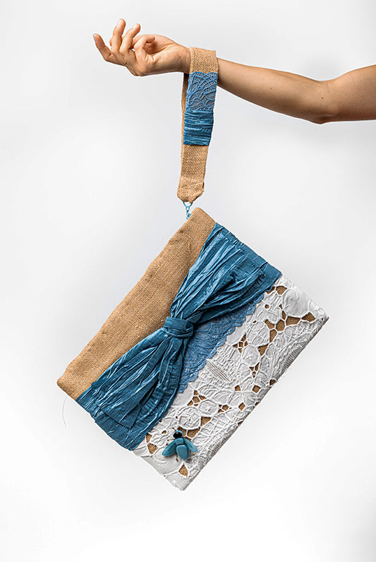 Borsa interamente realizzata in juta naturale, impreziosita da ricercati pizzi e merletti.