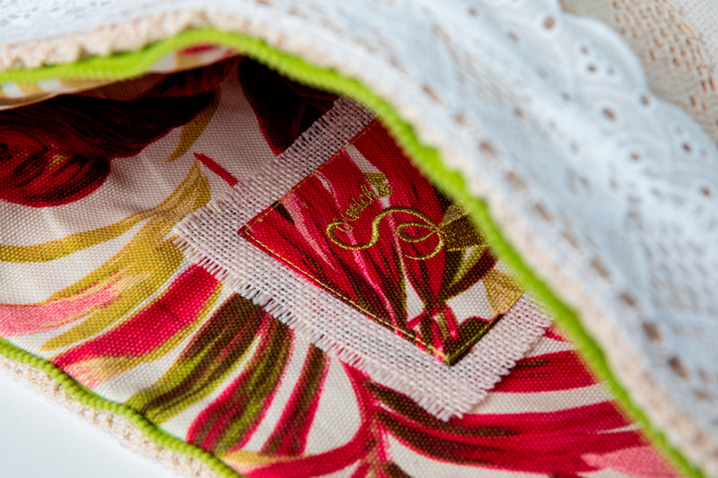 Borsa interamente realizzata in juta naturale, impreziosita da ricercati pizzi e merletti.
