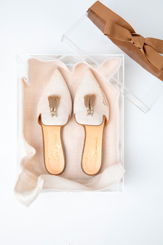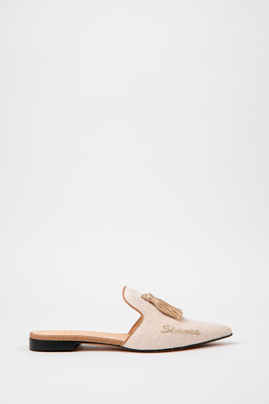 Il modello AGATA MULE di "Le Boffi" realizzato per Simichic in juta naturale, impreziosito da ricercati filati e tessuti personalizzato con il tuo nome.